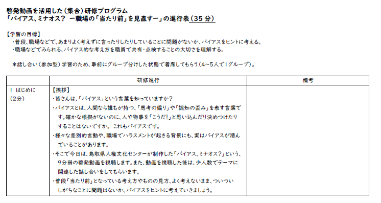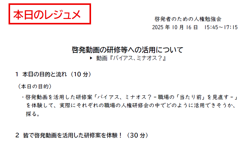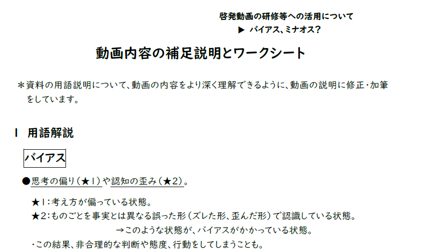 学習テーマ:啓発動画の研修等への活用(対象動画:バイアス、ミナオス?)