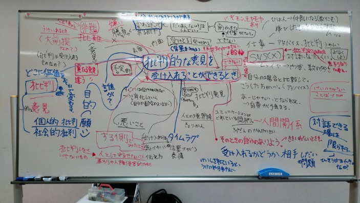 「受け止めはするが、受け入れられない場合もある」「誰に言われたか人間関係による」「自分とは異なる意見を言ってもらったと思って受け入れる」等、仕事や家庭生活を具体的に想像しながらの意見もあれば、「政治や権力に対して批判できない社会は危険」等、社会のありようや、社会と個人の関係に注目した意見も出されました。