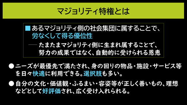 マジョリティ特権は、差別を受ける側ではない人々、言い換えれば、差別を他人事のように感じがちな人々の生態に注目して、その意識や態度、行動がどのように差別を生み、維持・強化しているかを考えることができる、大変重要な学習テーマです。どうすればより分かりやすくお話しできるかと、毎回色々な工夫を試みていますが、納得できるレベルをめざして今後も精進します!