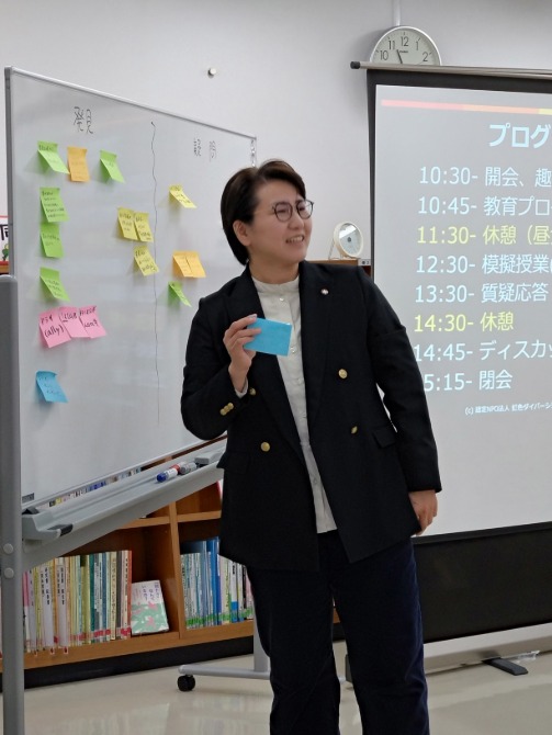当日は虹色ダイバーシティ代表の村木さんと奥野さんにお越しいただき、模擬授業のほか、本プログラムの制作背景や意義、プライドセンター大阪の紹介等をしていただき、質疑応答や意見交換等を行いました。